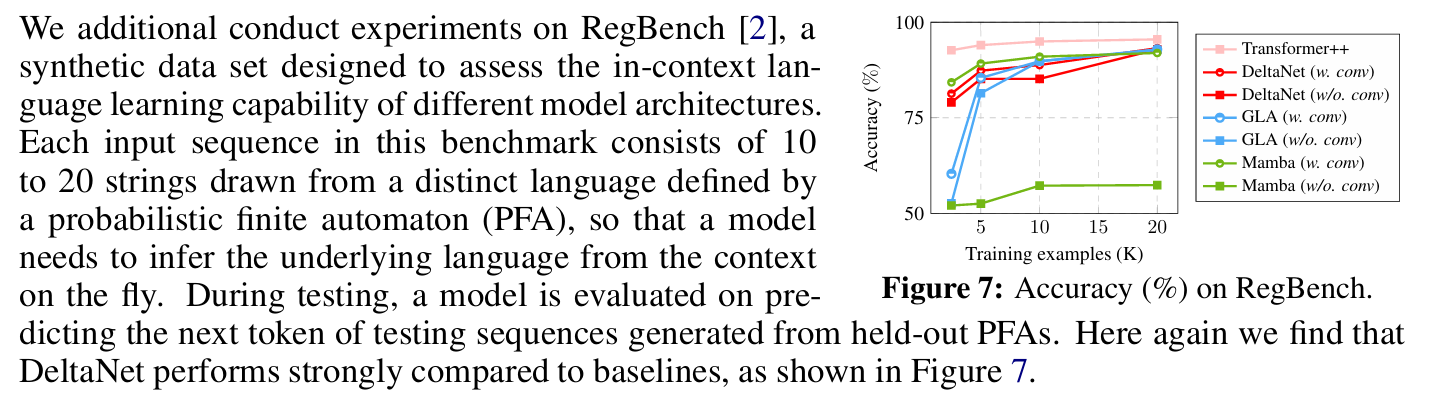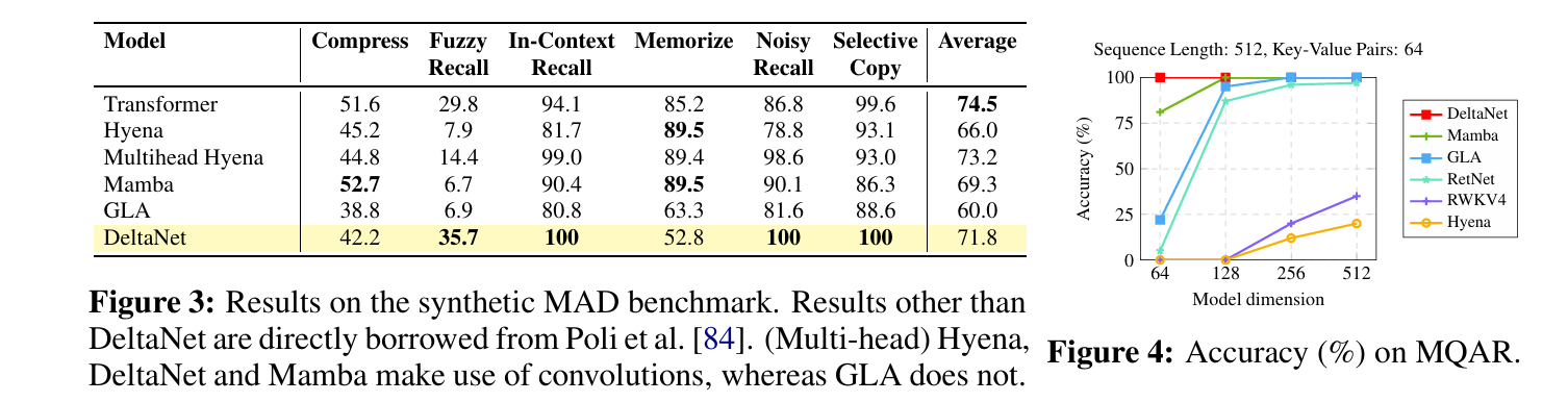 This benchmark comes from Measuring and Improving Recall in Efficient Language Models. MQAR is used to evaluate recall ability. In this experiment, DeltaNet does not use convolution, while the other training settings remain the same as in the paper.